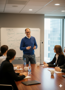Das Bild zeigt Heiko Fahrenholz stehend vor einem Metaplan. Andere Personen sitzen. Es ist handelt sich um eine Szene aus einer Projektsupervision.